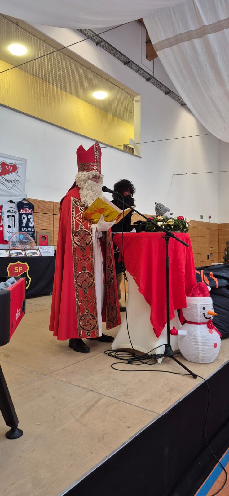 Kurz darauf kündigte sich der Besuch des Nikolaus und seines Kramperl an. Mit charmanten Verserln, viel Lob und einem Augenzwinkern brachte er nicht nur festliche Stimmung, sondern auch großzügige Geschenke mit. Jeder Jugendspieler erhielt eine neue Trainingsjacke mit frischem Vereinslogo und Schriftzug „SF Egling-Strasslach“ sowie eine neue Trinkflasche – eine tolle Überraschung, die sofort begeistert angenommen wurde.